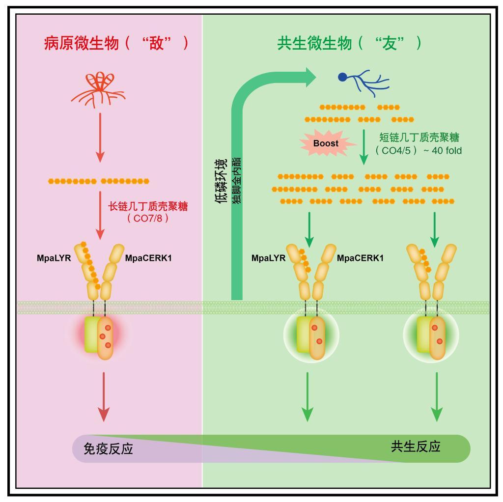 “自2013年起,我们团队就持续研究植物中的CERK1受体激酶。随着研究不断深入,首次发现粗裂地钱中有一对受体激酶—MpaLYR和MpaCERK1,能够精准区分共生与病原微生物,并激活不同的下游信号通路。”王二涛说,“其中,MpaLYR负责识别微生物来源的信号分子,既能结合共生微生物的分子标志物,也能结合外源真菌产生的病原分子标志物,并通过与MpaCERK1形成蛋白复合体,激活相应的共生或免疫下游信号途径。”